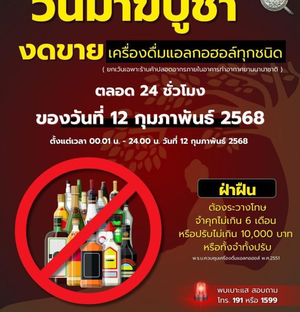 กองสารนิเทศ สำนักงานตำรวจแห่งชาติ ขอย้ำเตือนร้านค้าและผู้ประกอบการให้งดขายเครื่องดื่มแอลกอฮอล์ทุกชนิด ทั้งชนิดขายส่งและขายปลีกทั่วราชอาณาจักร ตลอด 24 ชั่วโมง ตั้งแต่ 00.01 – 24.00 น. ของวันที่ 12 กุมภาพันธ์ 2568 (ยกเว้นการขายเฉพาะร้านค้าปลอดอากรภายในอาคารท่าอากาศยานนานาชาติ) หากฝ่าฝืนมีความผิดตามมาตรา 39 แห่ง พ.ร.บ.ควบคุมเครื่องดื่มแอลกอฮอล์ พ.ศ.2551