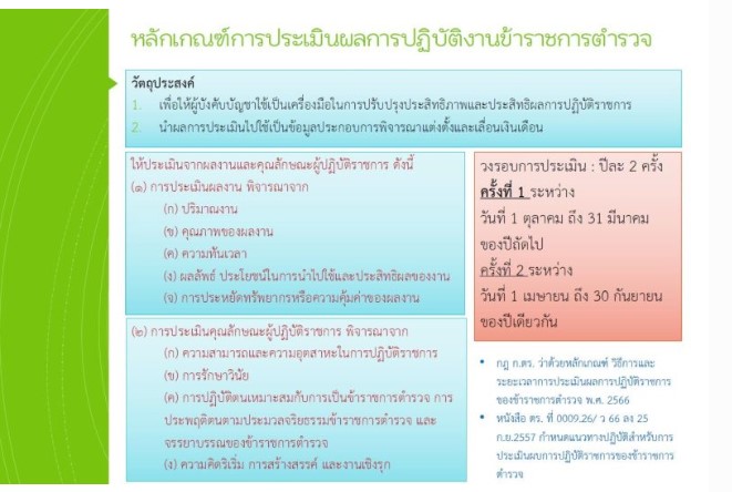 - กฎ ก.ตร.ว่าด้วยหลักเกณฑ์ วิธีการ และระยะเวลาการประเมินผลการปฏิบัติราชการของข้าราชการตำรวจ พ.ศ. 2566